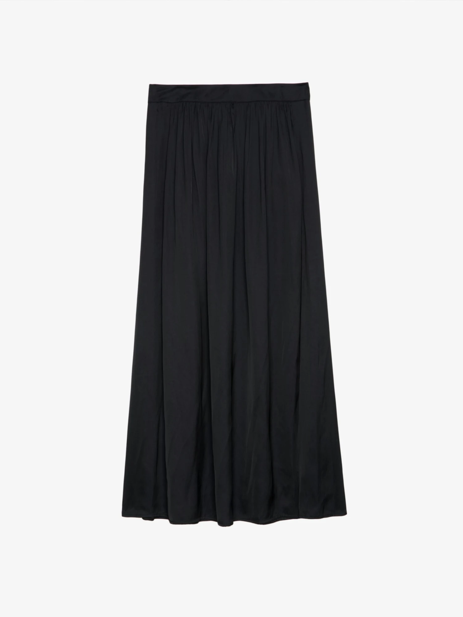 -Women’s long black satin pleated skirt designed with fluid movement and soft draping