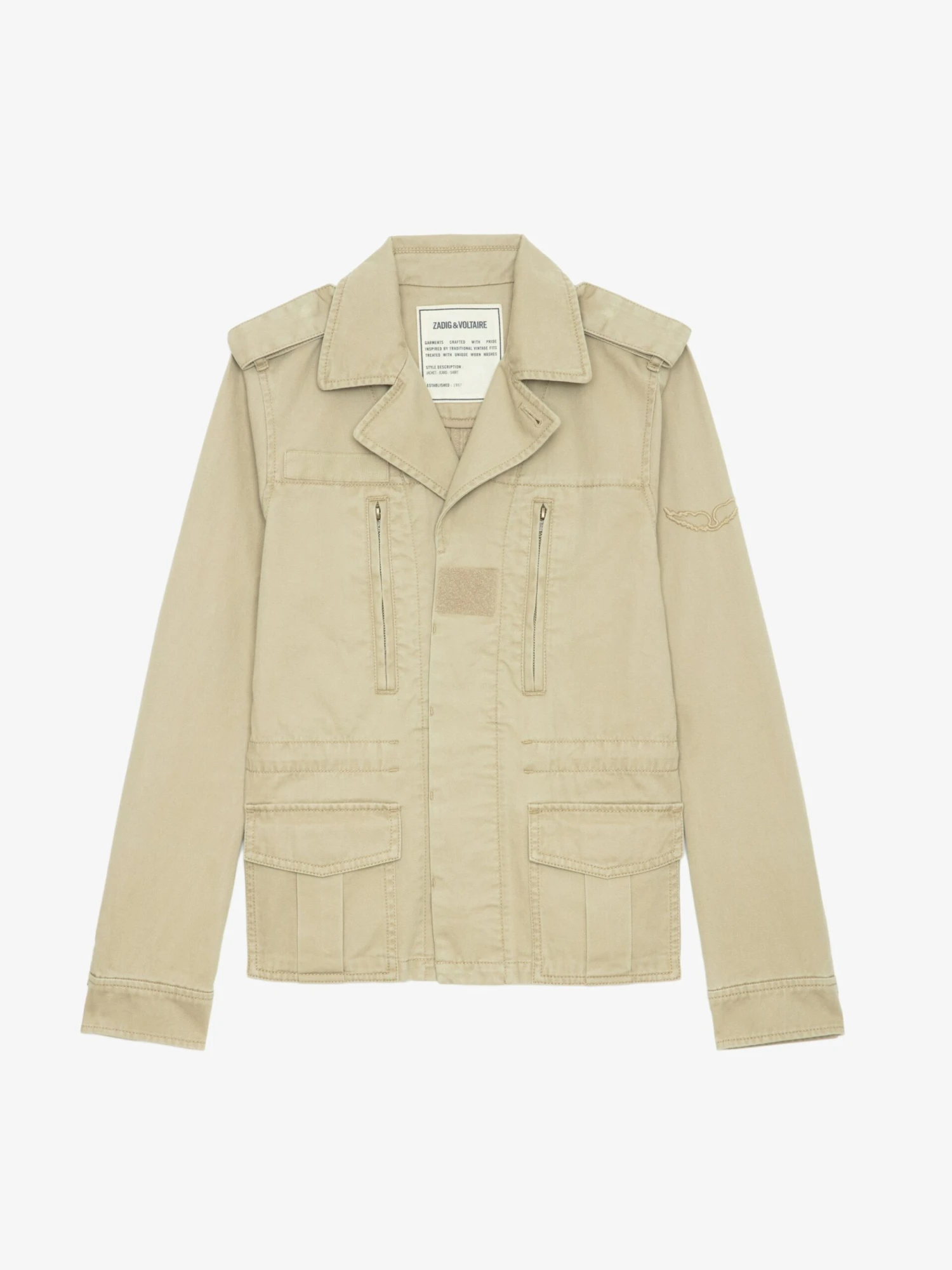 – 2 zipped chest pockets and 2 side pockets with pointed flap