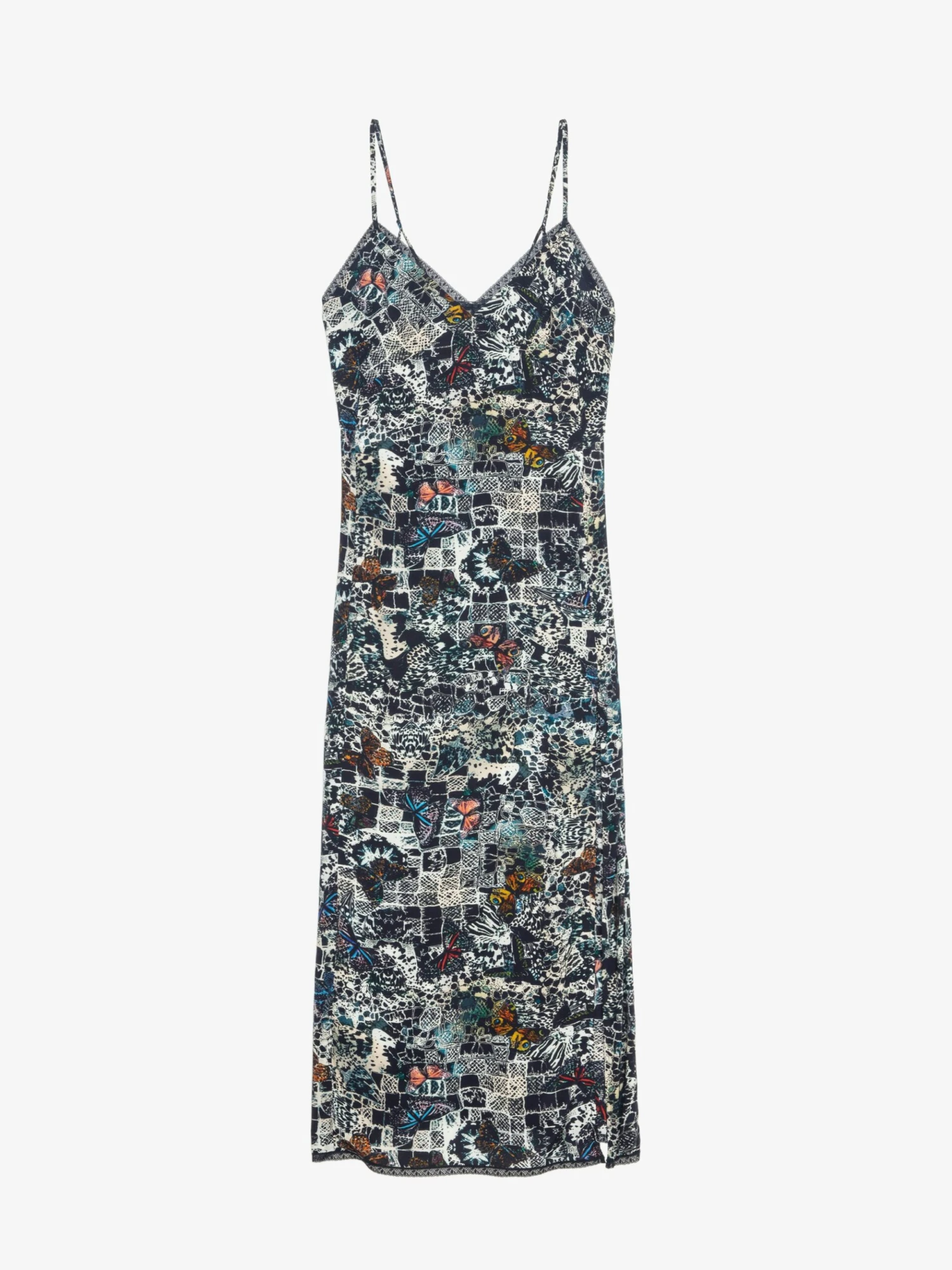 – Encre blue long lingerie-style inspired butterfly print dress for women