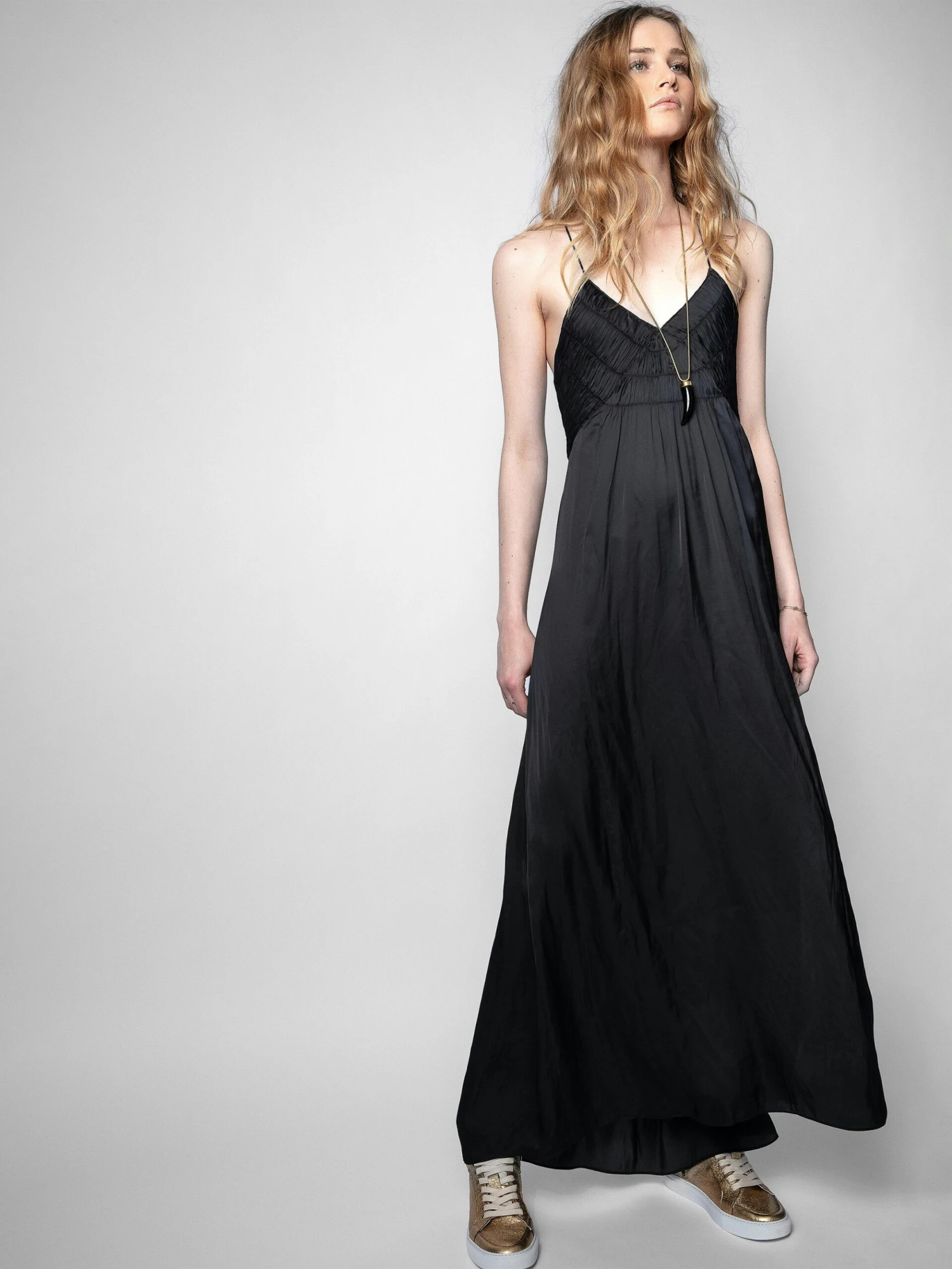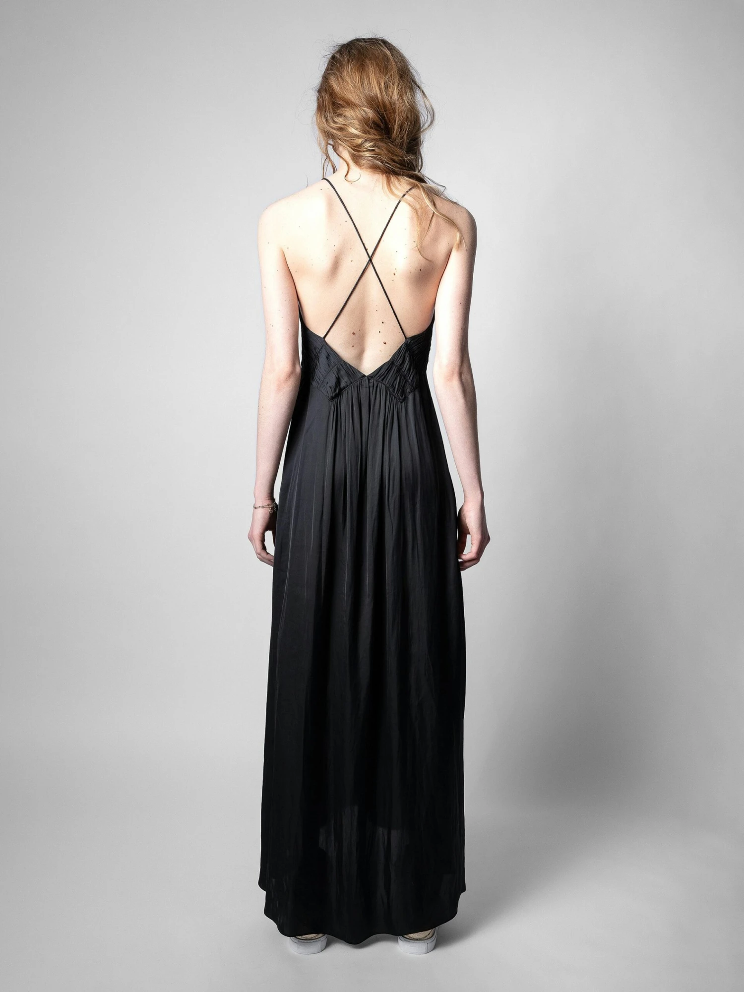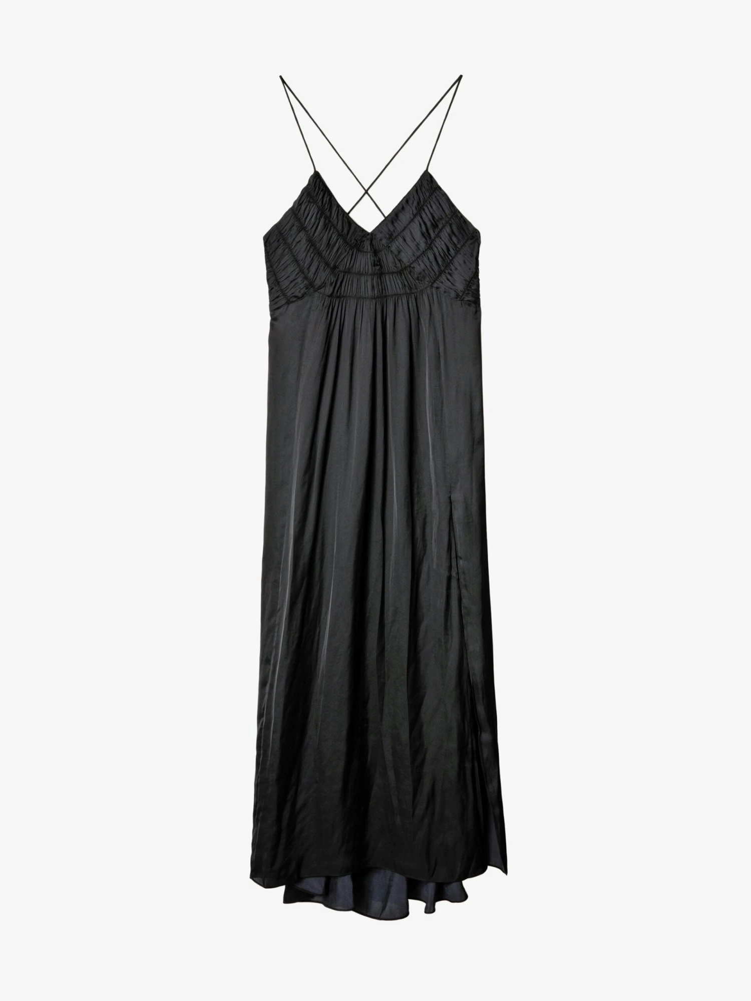 The Rayonne dress is full of feminine details: its front slit reveals the leg, its bib features gathered details and its thin straps cross over in the back.