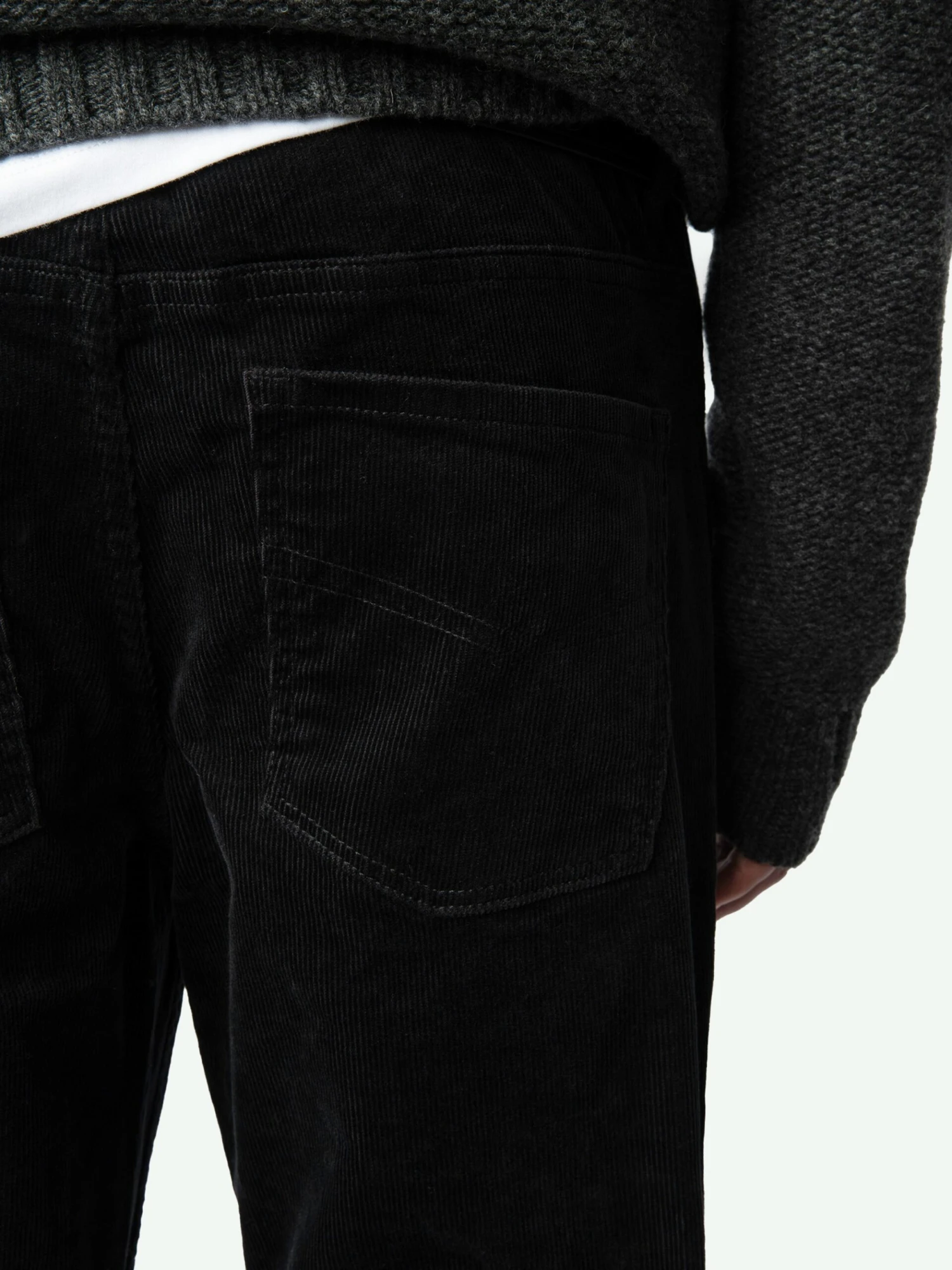 – Men’s slim-fit black corduroy pants with a worn effect for