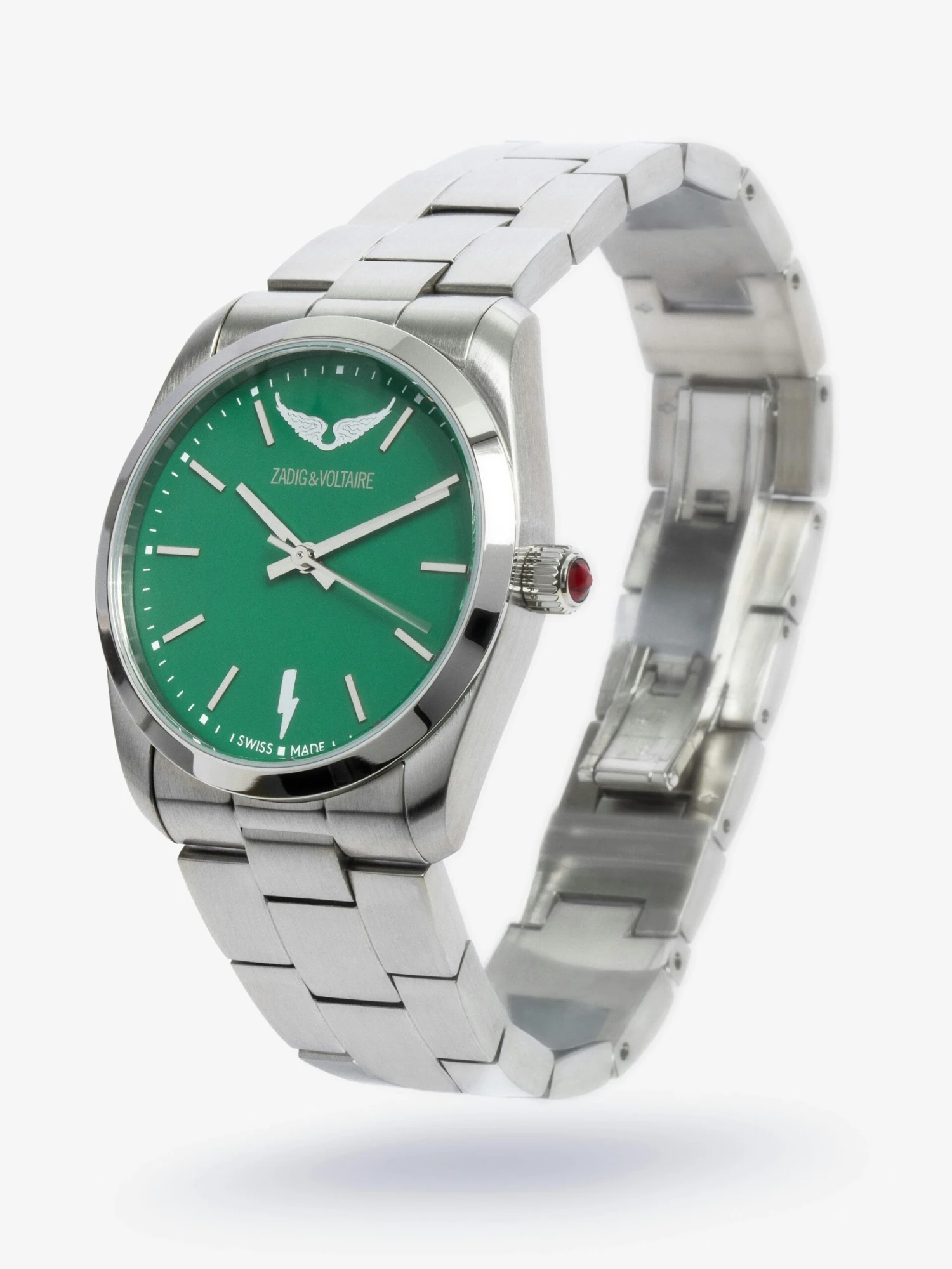 Switch to Zadig&Voltaire time with this stainless steel watch set with a rhinestone, with a matte green face in the signature style of the brand.
