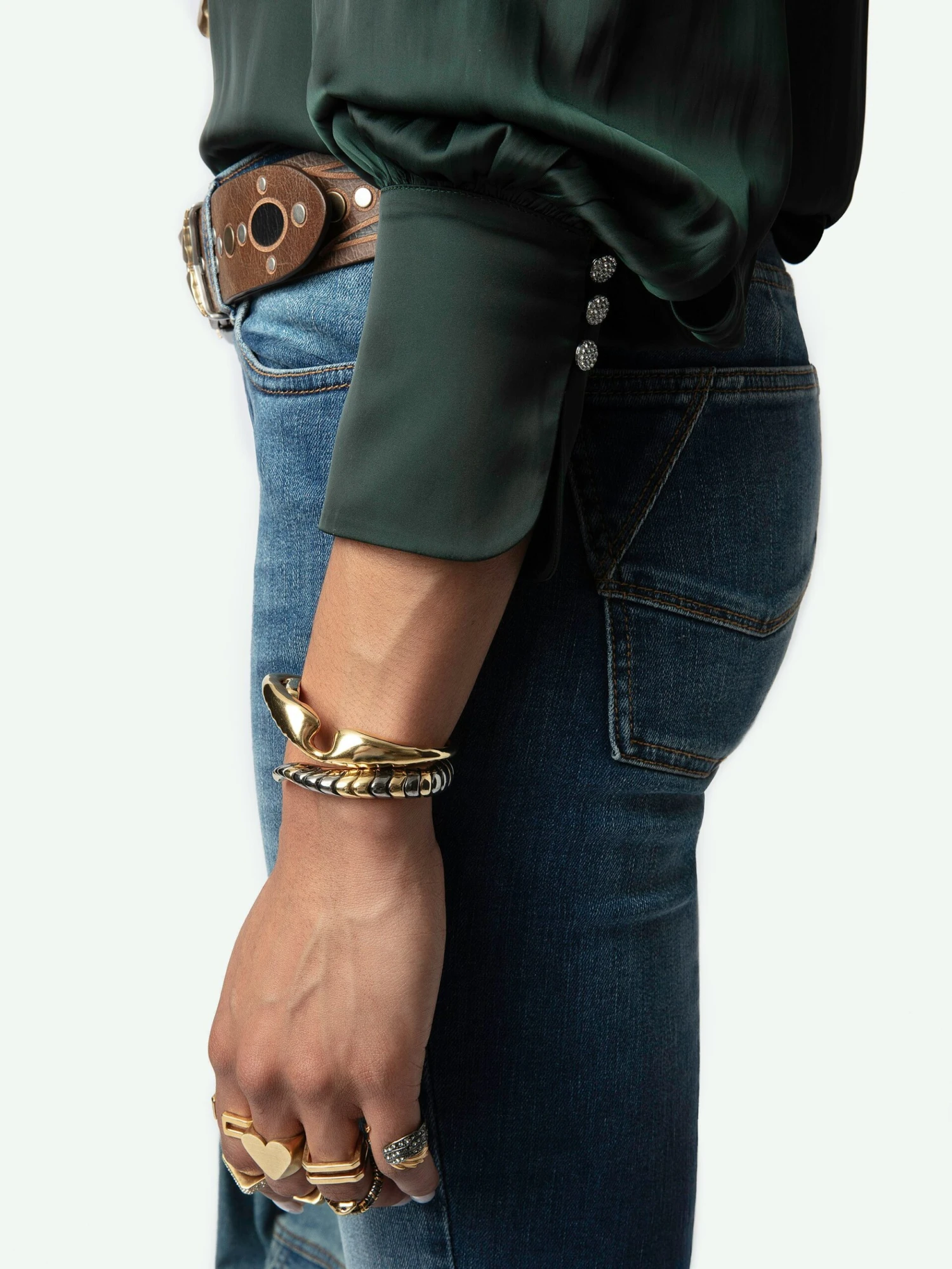 – Long, full sleeves and fitted cuffs with diamanté values