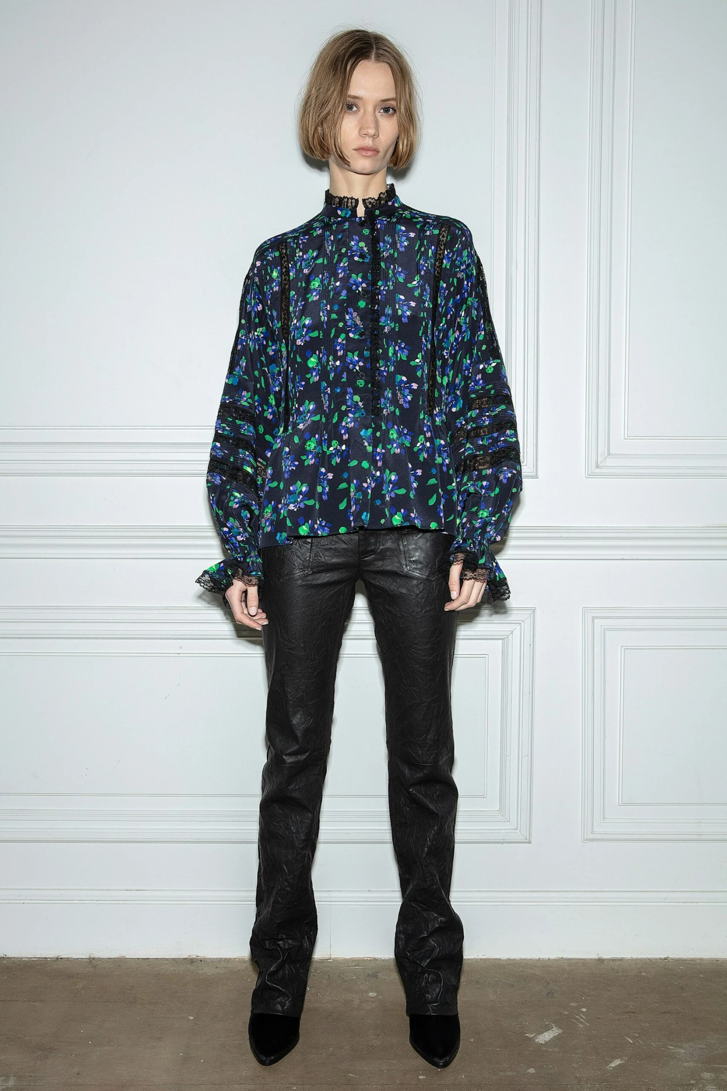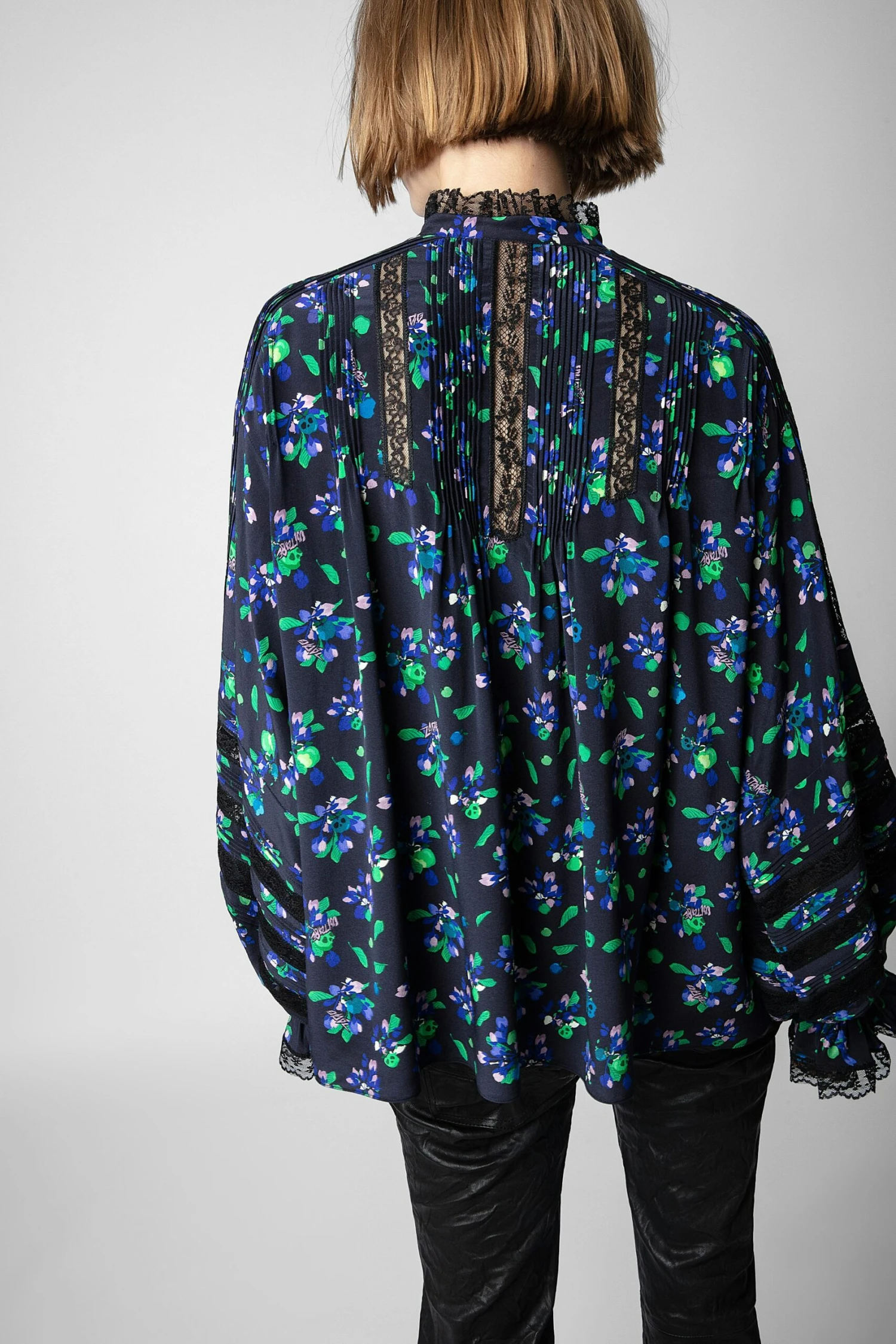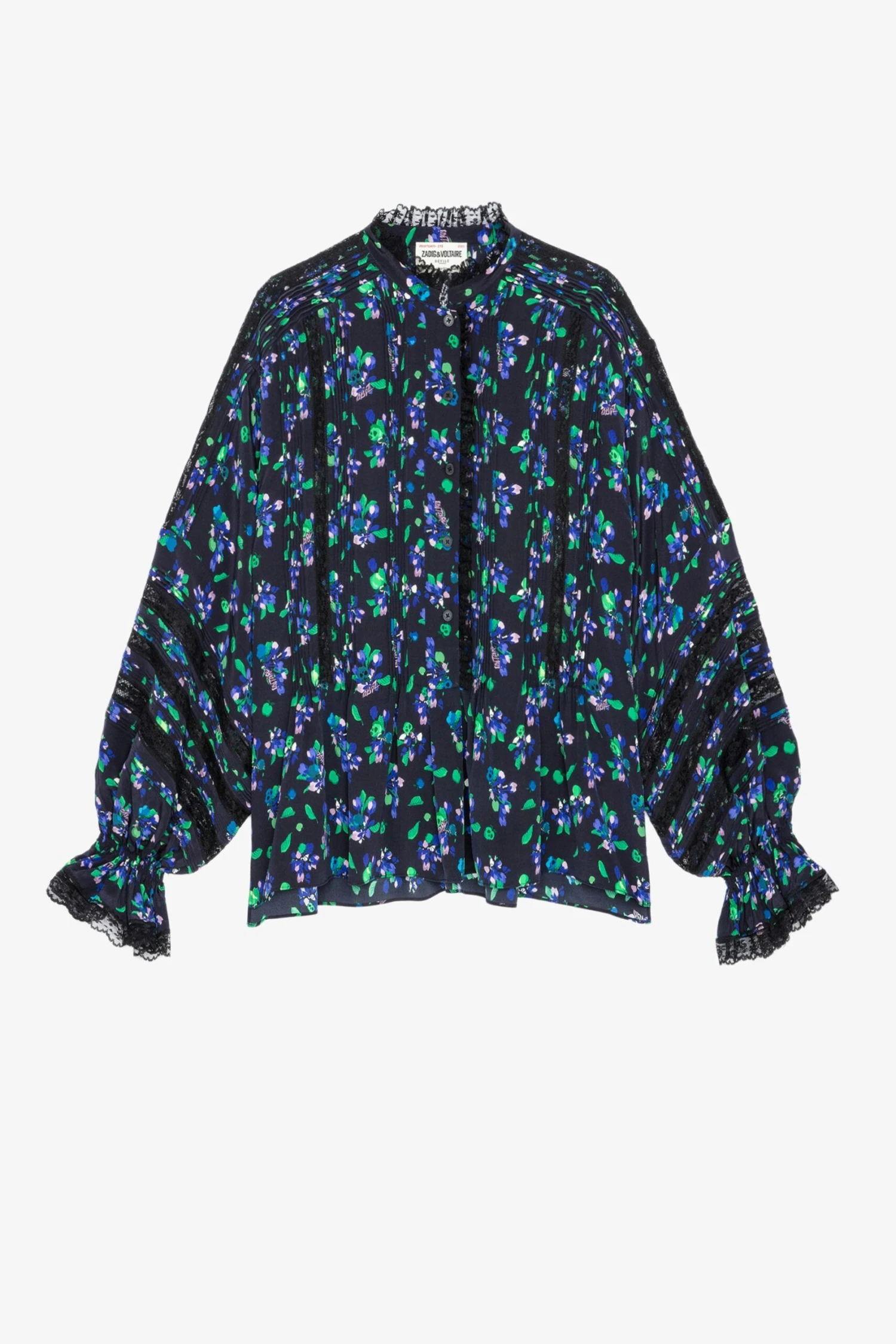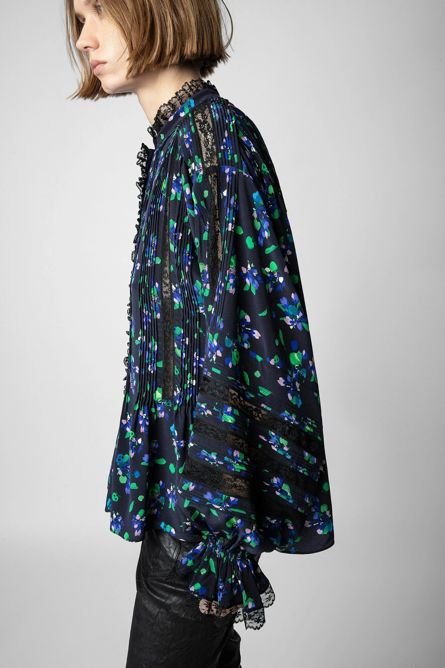 This oversized silk blouse, with long sleeves and cuffs, plays with volume and transparency and is embellished with a floral print and bands of lace.